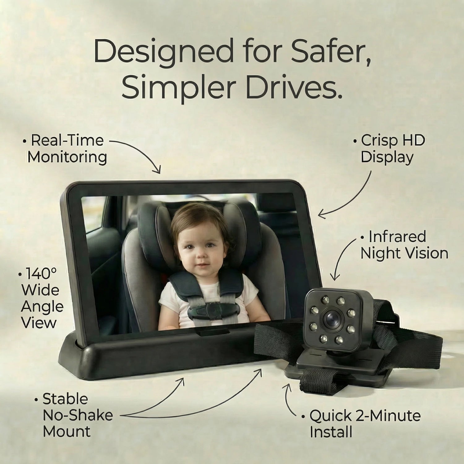 The SafeBub™ Baby Car Camera is a plug-and-play in-car video system that lets you clearly see your baby on a dash-mounted monitor while you drive. Instead of twisting around or relying on a shaky mirror, you get a crystal-clear, real-time view of your little one - even at night - simply by glancing at the screen in your natural line of sight.